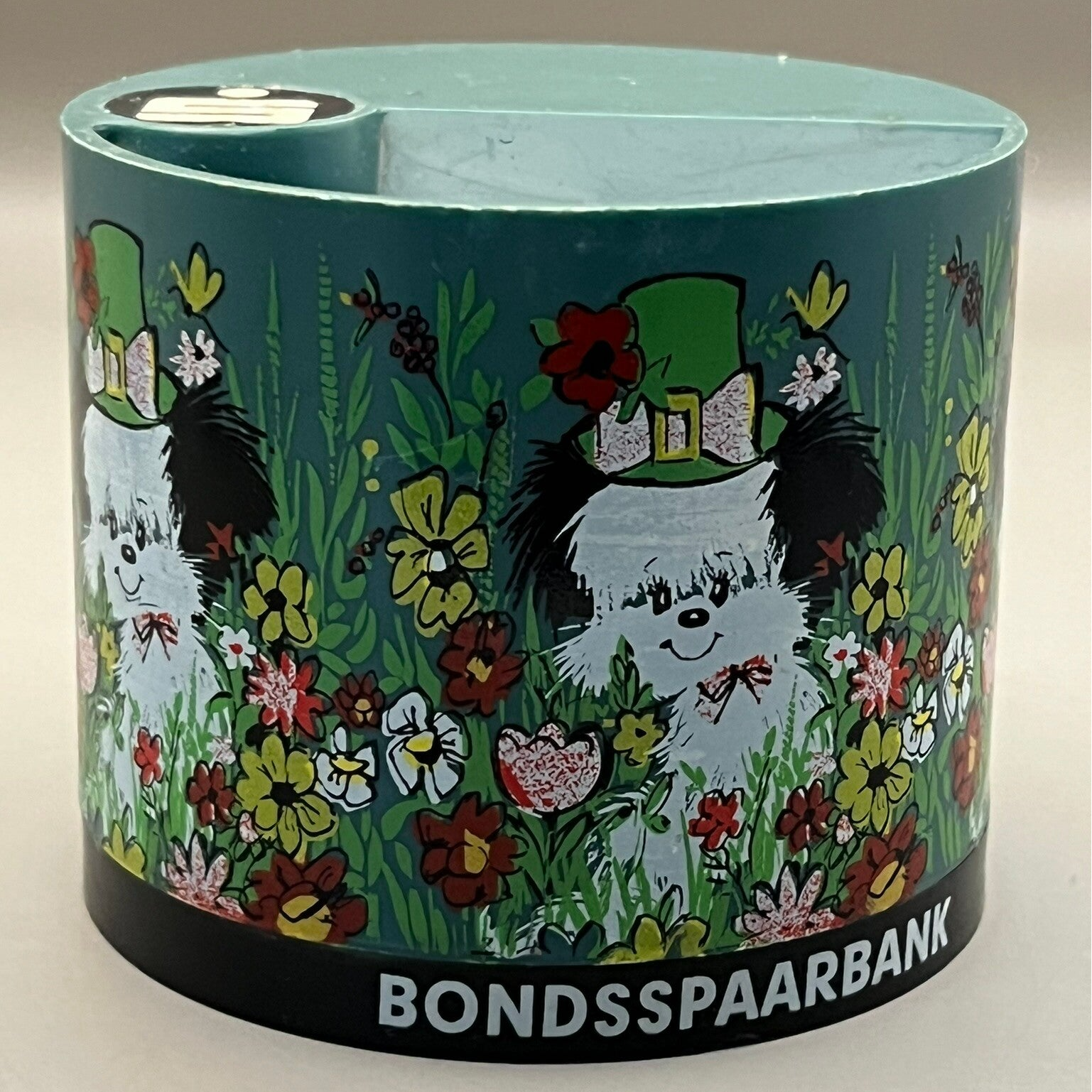 Spaarpotje van de Bondsspaarbank met daarop verschillende prints. Helaas missen de bijbehorende sleuteltjes maar ook om gewoon neer te zetten is deze erg leuk.