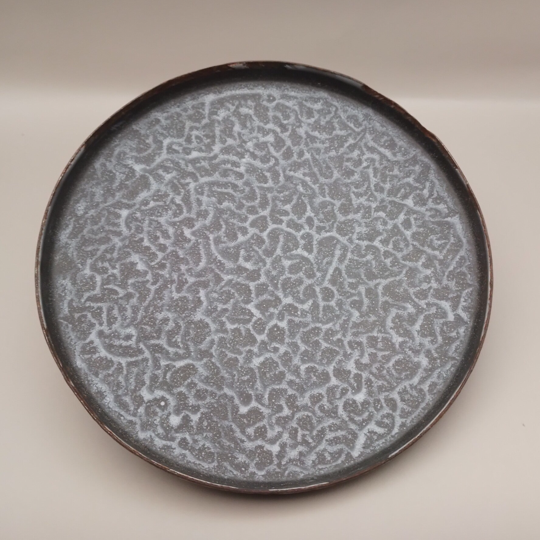 Vintage pan, grijsgewolkt emaille pannetje met deksel. Door schade/roest aan de binnenkant van dit pannetje is deze vooral geschikt als decoratie object.