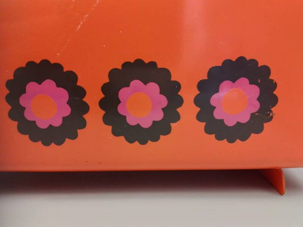 Dit prachtige vintage ontbijtkoekblik van Brabantia uit de Patrice serie is een ware eyecatcher in de keuken. De kleur oranje met paars roze bloemen geeft een vrolijke en retro uitstraling. Ondanks dat het blik enkele kleine gebruikssporen heeft, is het nog steeds in goede staat zoals te zien is op de foto's. Het houten plankje dat oorspronkelijk bij het blik hoorde ontbreekt, maar dit doet niets af aan de functionaliteit ervan. Dit ontbijtkoekblik is perfect voor het bewaren van ontbijtkoek of andere lekkernijen. Een must-have voor liefhebbers van vintage keukenaccessoires!