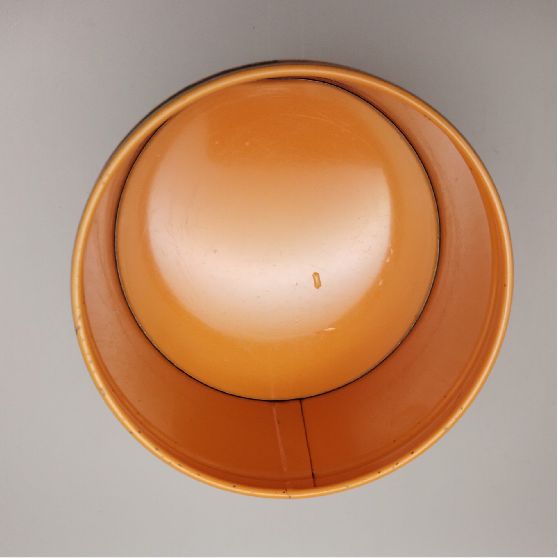 Voorraadbus voor thee van Brabantia in de kleur oranje. Met sierlijke witte letters, uit de jaren zeventig. We hebben nog meer items van deze serie.