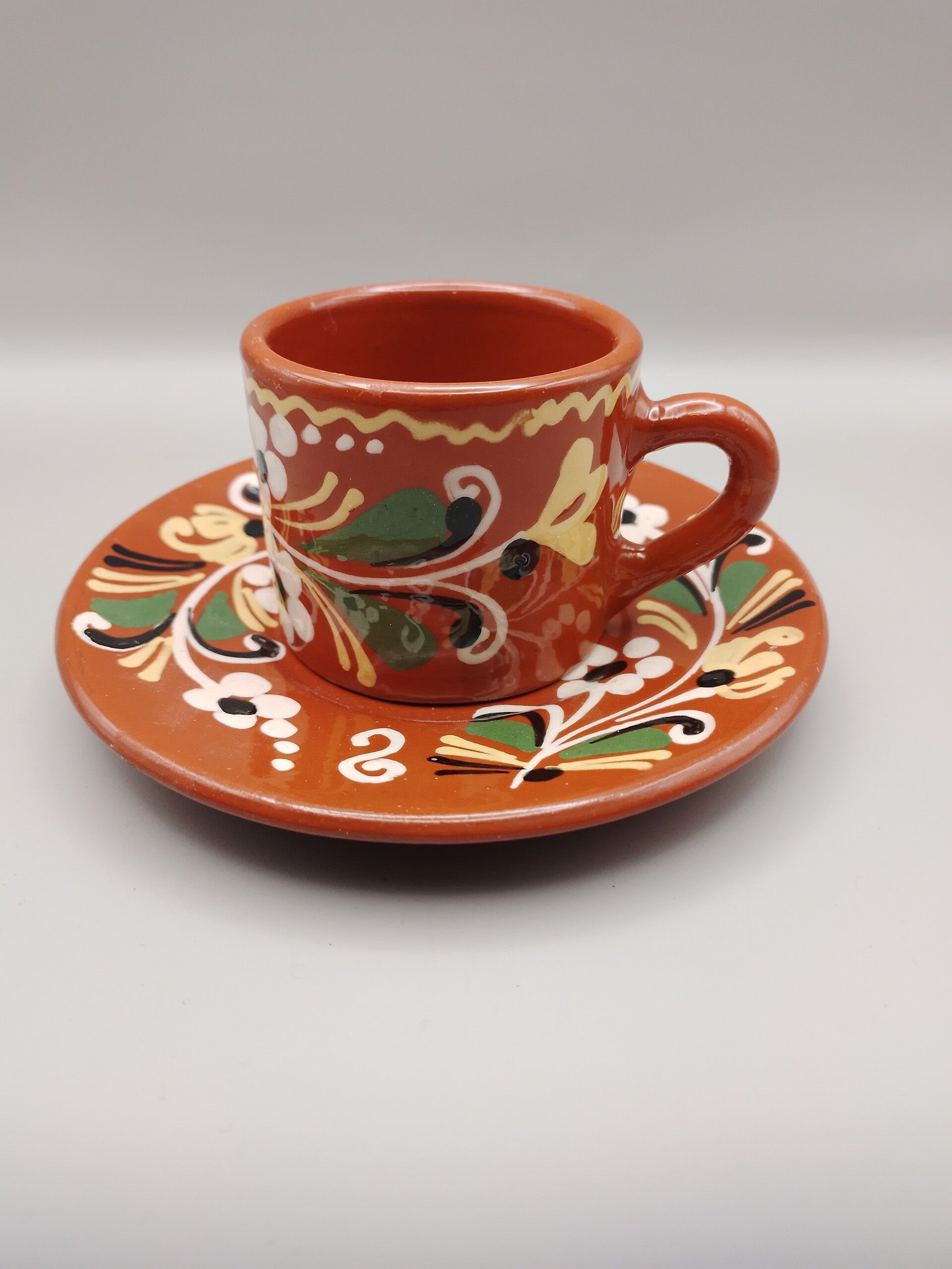 Kop en schotel groen handgeschilderd Fries aardewerk. Er is ook een rode en zwarte versie van dit kopje in de webshop te vinden.