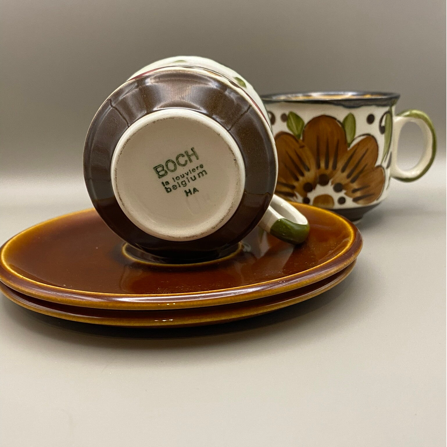 Kop en schotel set, kopje is van het merk Boch uit Le Louviere in België, schotel is hier niet gemerkt maar past er mooi bij! Helaas is er van één van de schotels een chipje af (zie foto).