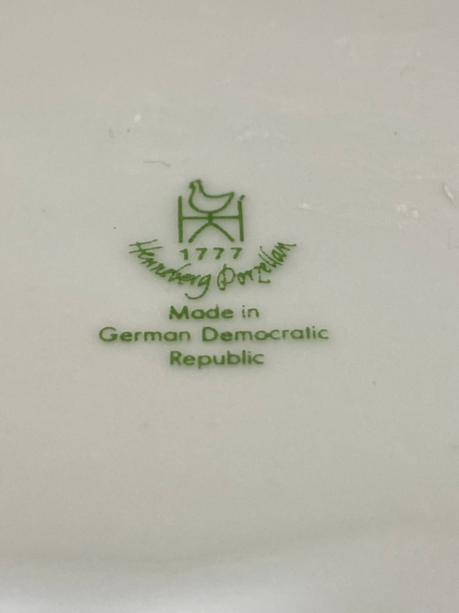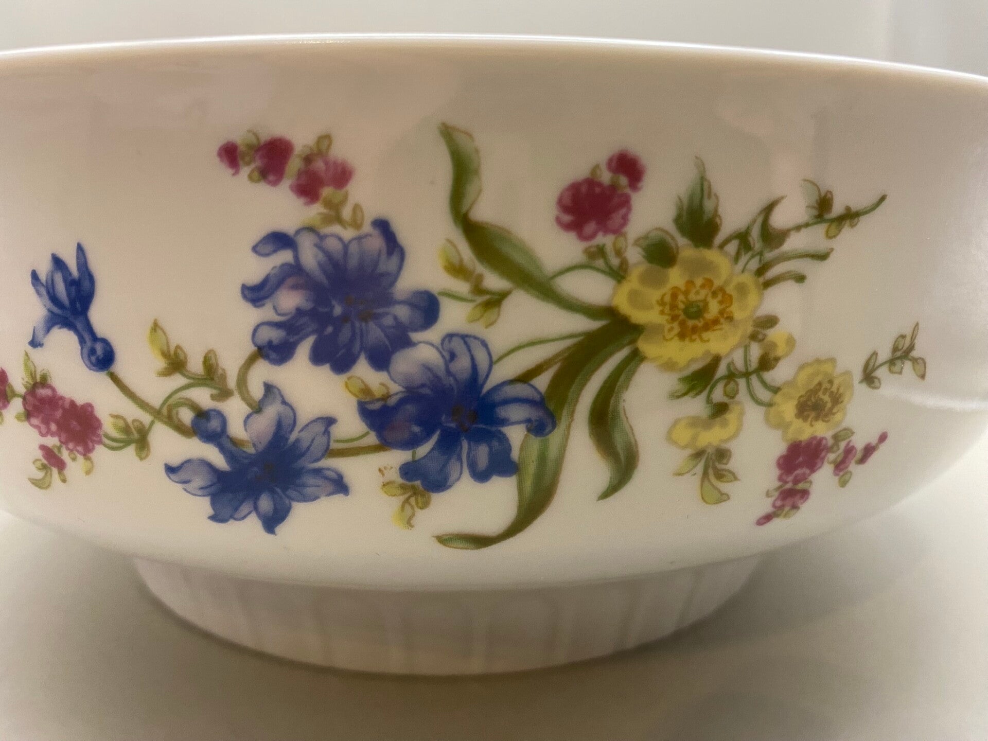 Witte schaal met gekleurde bloemetjes gemaakt door 1777 Henneberg Porzellan. De doorsnee van de schaal is 23 cm.