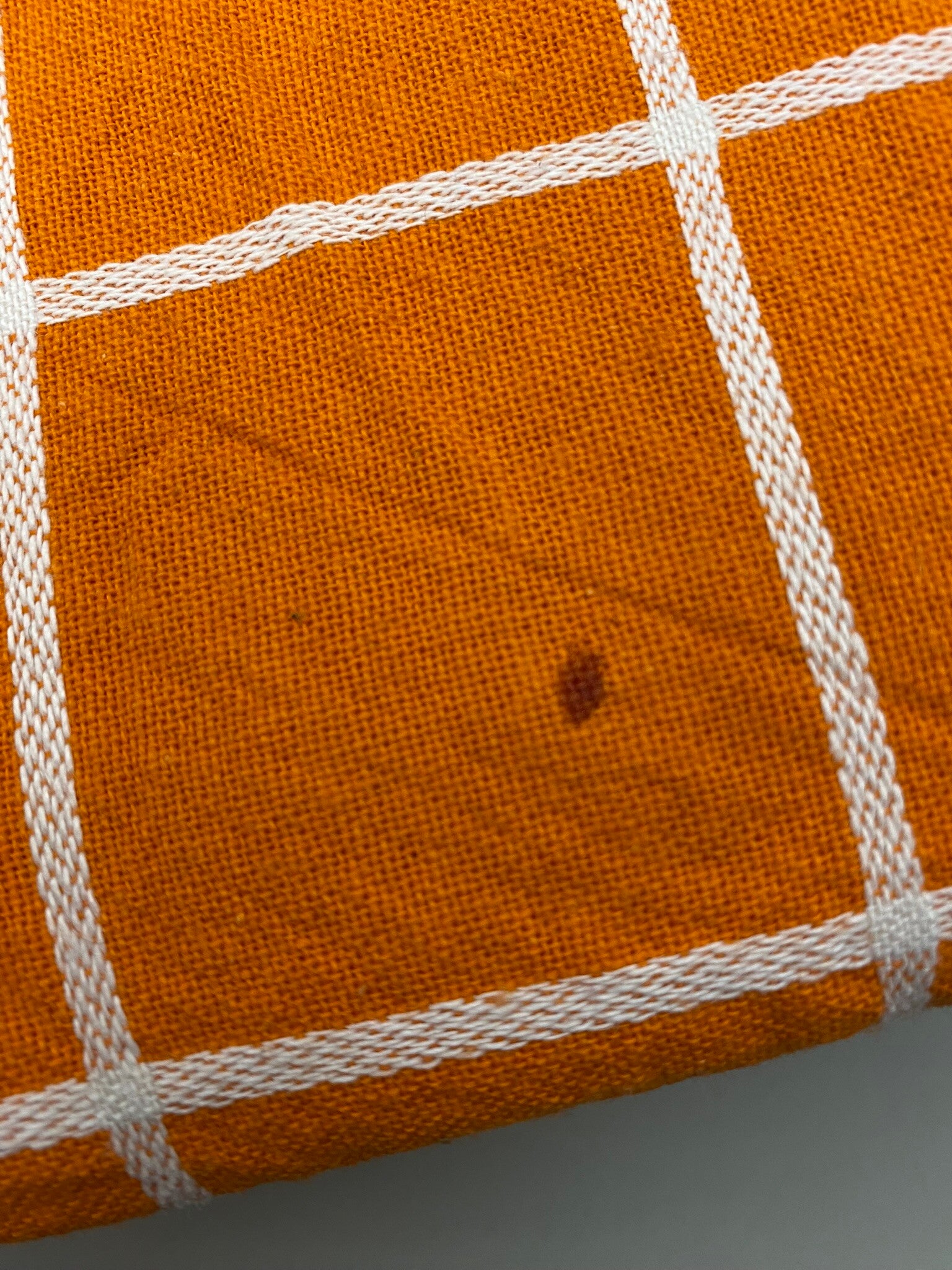 Oranje tafelkleed met witte strepen. Helaas zit er 1 vlekje op zoals te zien is op de foto, verder is het kleed in goede staat.