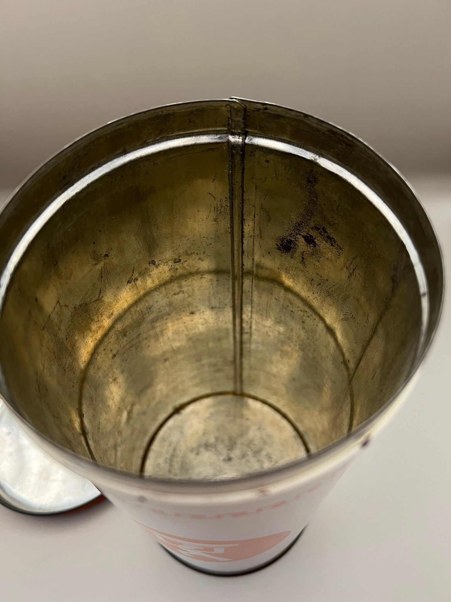 Leuke crèmekleurige beschuitbus met oranje deksel. Op de voorkant van het blik is een poppetje te zien met een grote beschuit boven zijn hoofd.